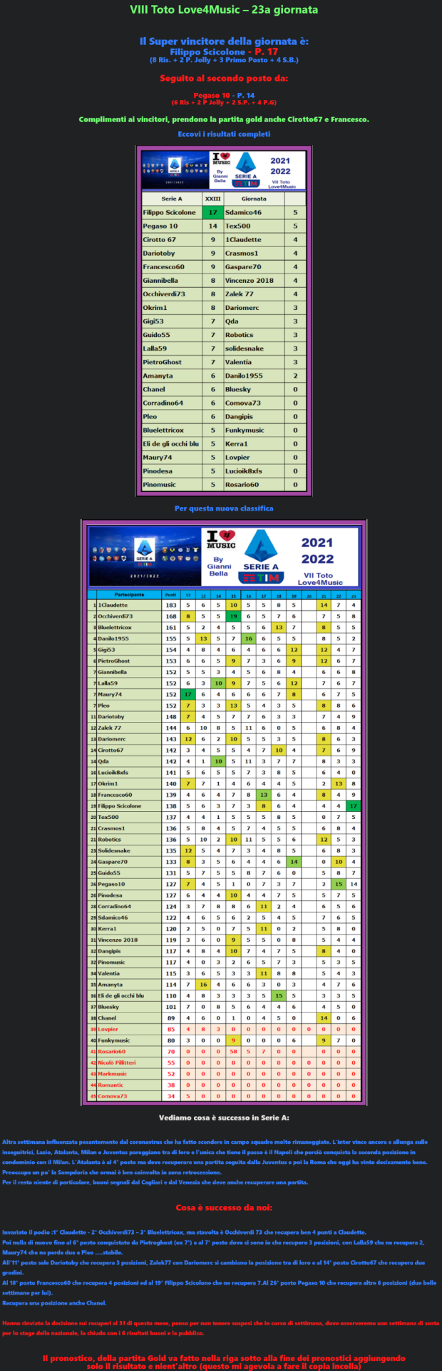 VIII Toto Love4Music – 23° Giornata Venerdì 21/01 ore 20.45 – Domenica 23/01 ore 20.45 Posted on 24/01/202215/08/2022 by dariotoby